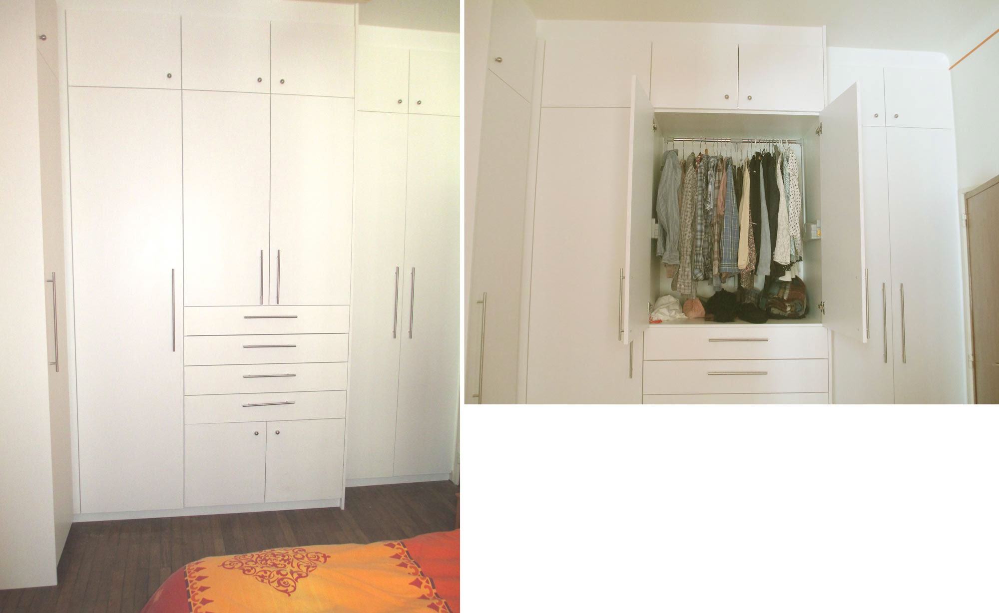 1. Placard, bibliothèque, tiroirs en MDF peint, plancher chêne huilé