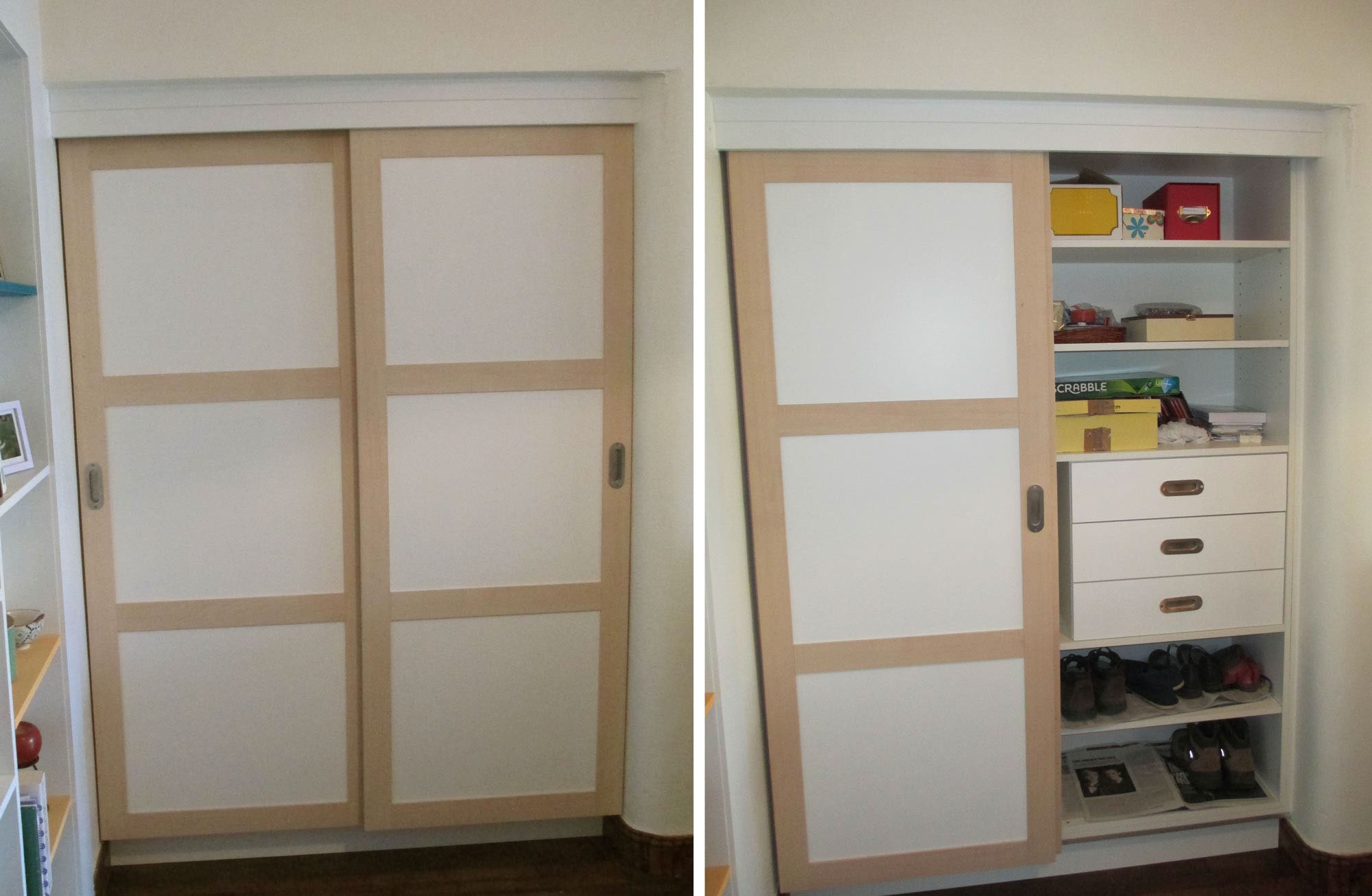 24. Placard portes coulissantes en MDF peint et hêtre.