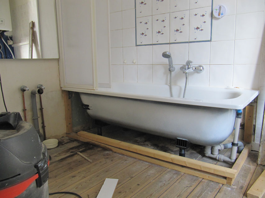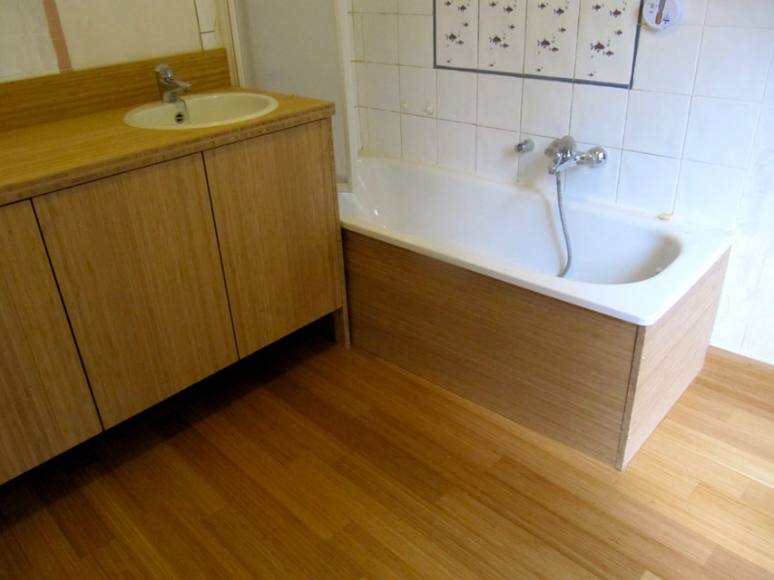 2. Salle de bain après : meuble, jupe baignoire et plancher en bambou huilé